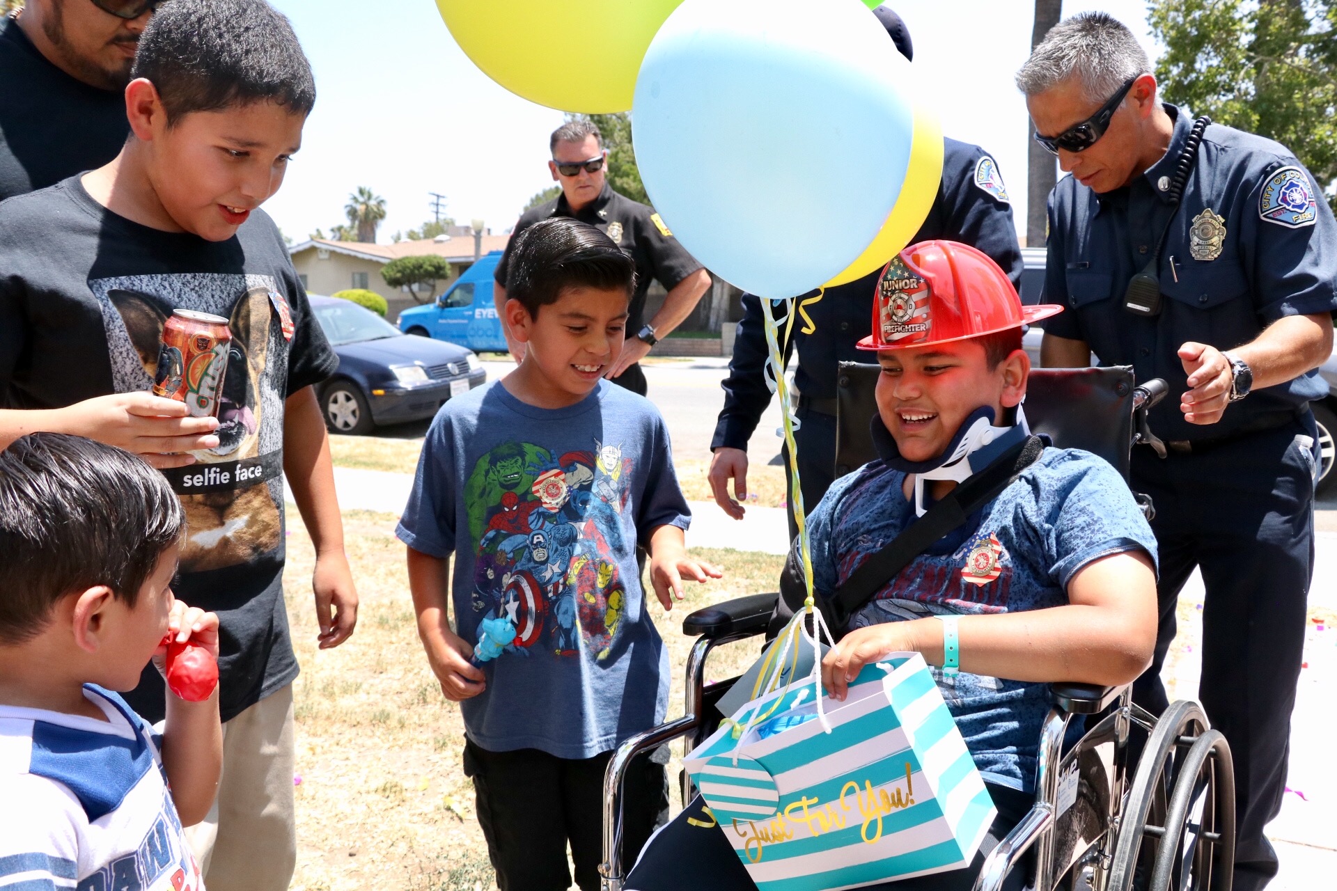 Photo/Anthony Victoria: Jonah Reyes, 8, being greeted by his cousins and Colton Firefighters on his arrival from the Loma Linda University Medical Center. Reyes, who attends U.S. Grant Elementary School, was hit by a car on June 12 on La Cadena Drive. He suffered a broken arm and leg.