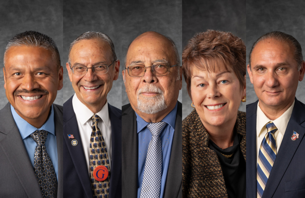 From left: Councilmember John Echevarria (District 4), Councilmember Dr. Luis González (District 3), Mayor Frank Navarro, Councilmember Kelly Chastain (District 2) and Councilmember David Toro (District 1) of the Colton City Council.