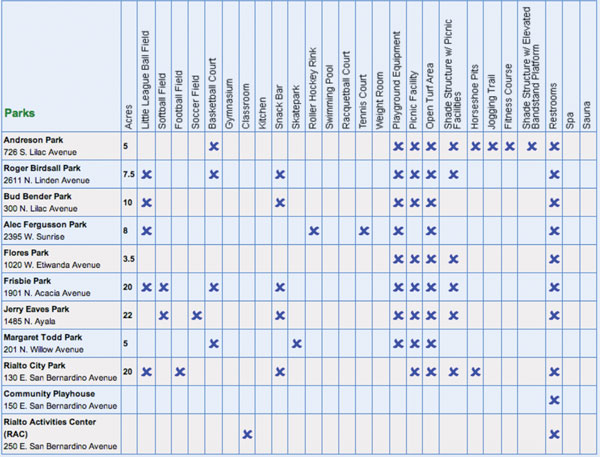 Currently the city has nine parks — Andreson, Birdsall, Fergusson, Frisbie, Bud Bender, Jerry Eaves, Margaret Todd, Flores and Rialto City Park.