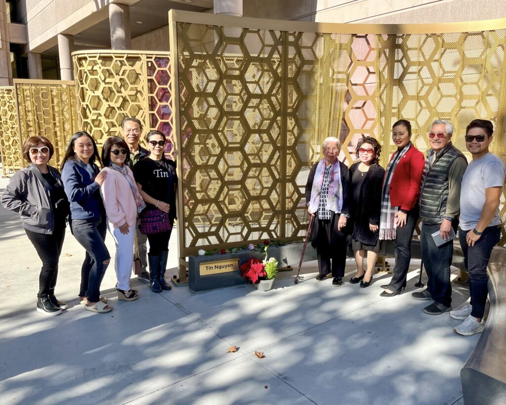 Photos by Manny Sandoval: The Nguyen Family and Mayor Helen Tran visiting Tin Nguyen’s memorial at the San Bernardino County Government Center’s Curtain of Courage Memorial on December 2, 2023.