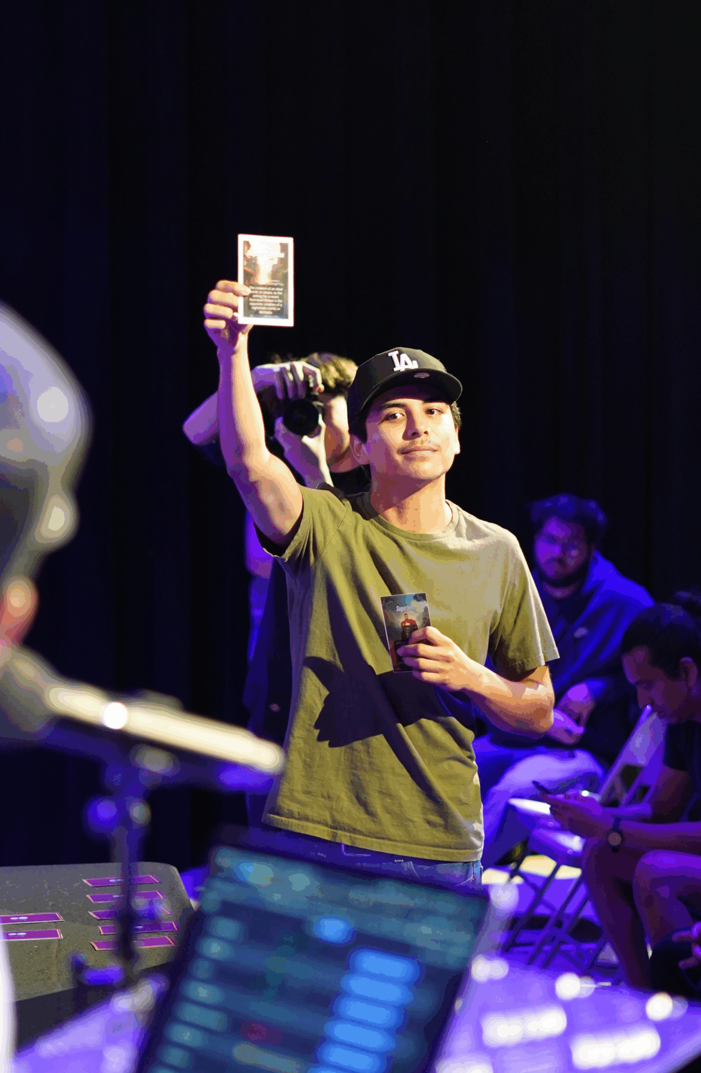 Photos by Manny Sandoval: A participant holds up a card revealing their chosen genre during the 48 Hour Inland Film Fest kickoff.