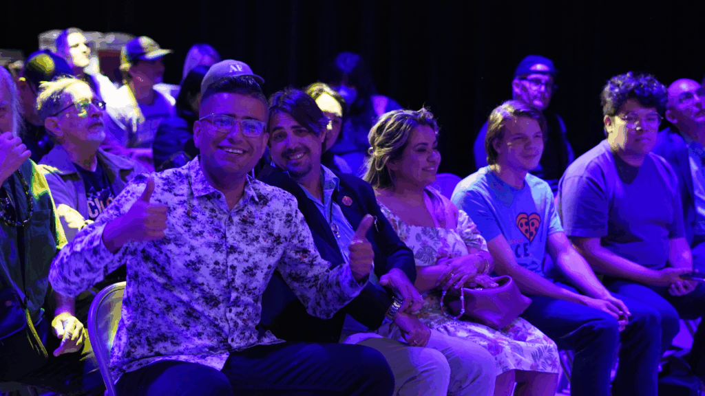 Three members of Phase3 Films, a competing team in the 48 Hour Inland Film Fest, sit in the front row at KVCR Public Media studios on Oct. 3, bringing high energy and enthusiasm to the kickoff event.