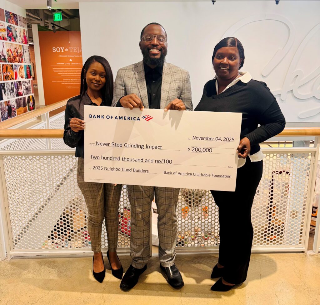 Building upon studies showing that early and ongoing exposure to college- and career-readiness opportunities can help foster success in students, Never Stop Grinding Impact created a new workforce readiness and economic empowerment initiative that provides paid internships, job training, financial literacy and mentorship programs to teens. The Neighborhood Builders grant will help fund intern stipends and scale this new program.