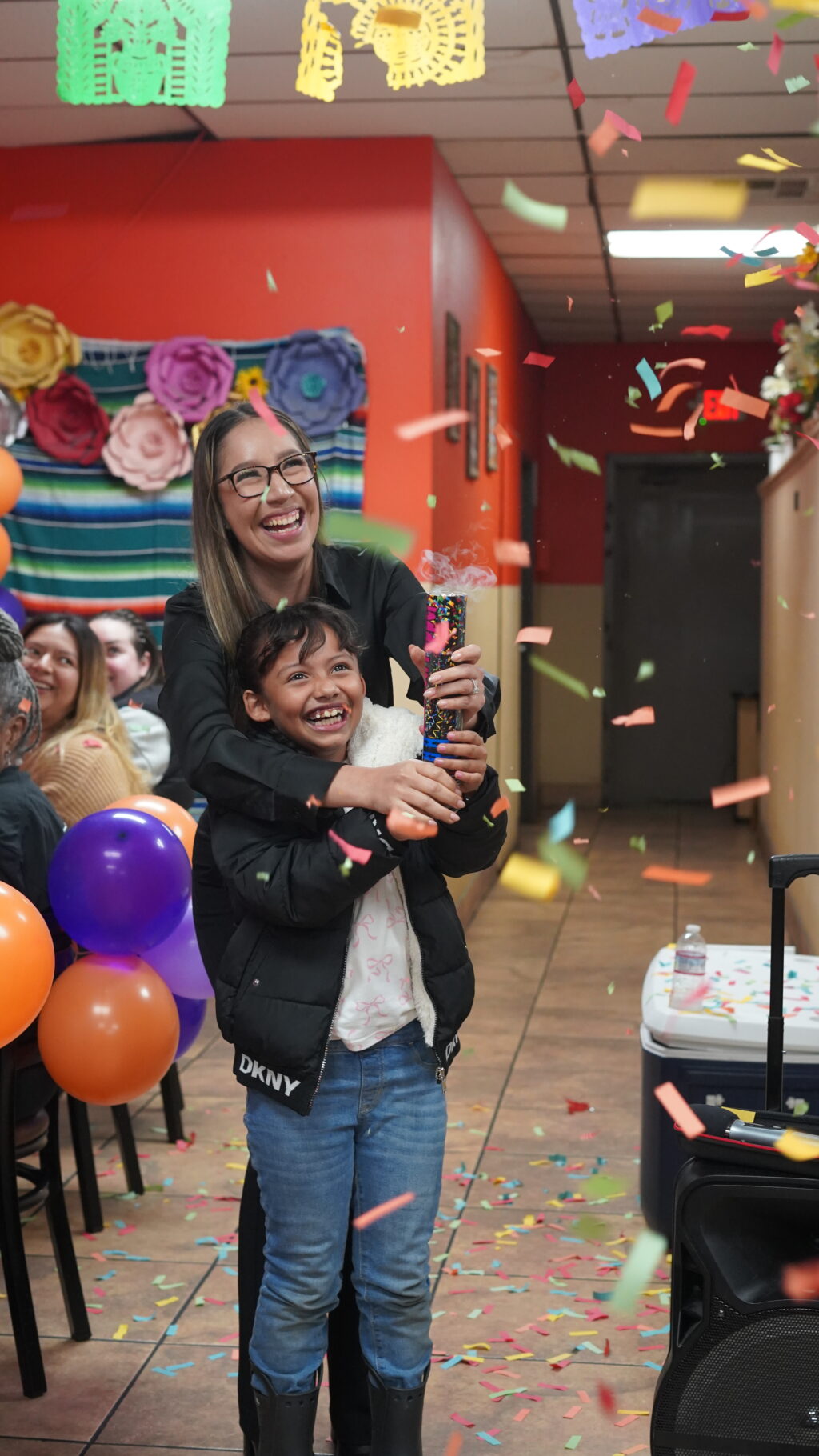 Photos by Manny Sandoval: San Bernardino Family YMCA Executive Director Jennifer Lopez and San Bernardino Y Member Joslenn, a scholarship recipient, popping confetti after announcing how close they are to reaching their donation goal.