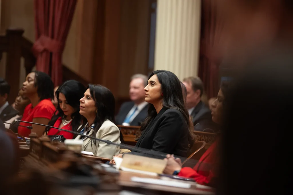 State Sen. Sabrina Cervantes requested an audit of three joint intelligence centers in California. Here, Cervantes listens during the swearing-in ceremony for Senate President pro Tempore Monique Limón in Sacramento on Jan. 5, 2026. Photo by Miguel Gutierrez Jr., CalMatters/Pool