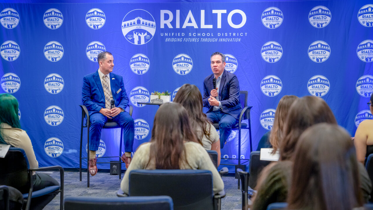 Photo MJ Duncan: Amazon Director of Operations Sumegha Mahankali, right of check, presents a $50,000 check to SBCUSD Superintendent Dr....