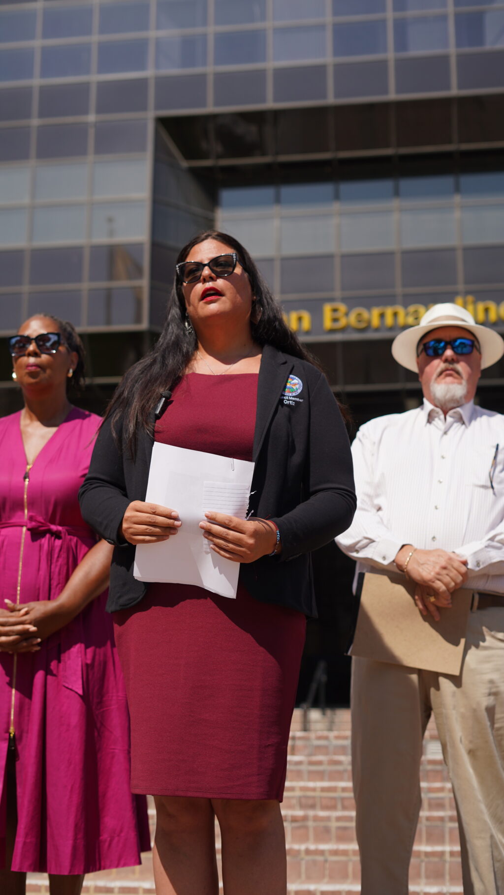 Speaking on the steps of San Bernardino City Hall on August 12, Ortiz alleged she learned Goodman told community members that if she continued her lawsuit, he would make certain “non-public records” available. Ortiz characterized the alleged comments as “a threat” and “blackmail.”