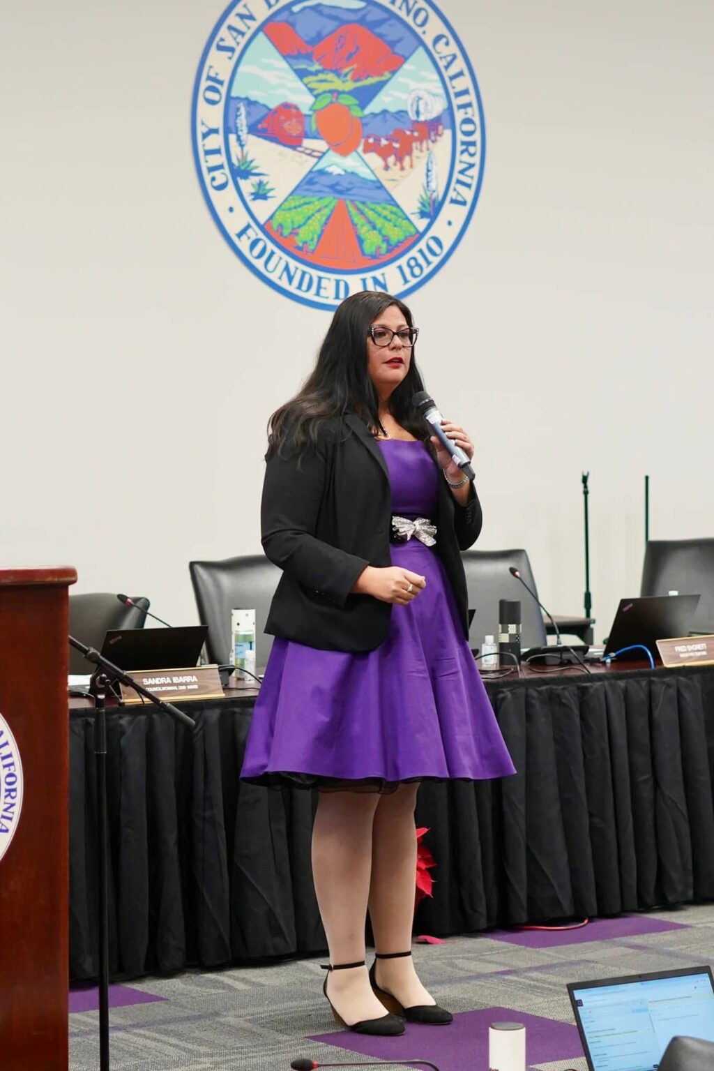 Photos by Manny Sandoval: San Bernardino City Councilwoman Dr. Treasure Ortiz speaks after being sworn in during a Dec. 18, 2024 City Council meeting at Feldheym Central Library.