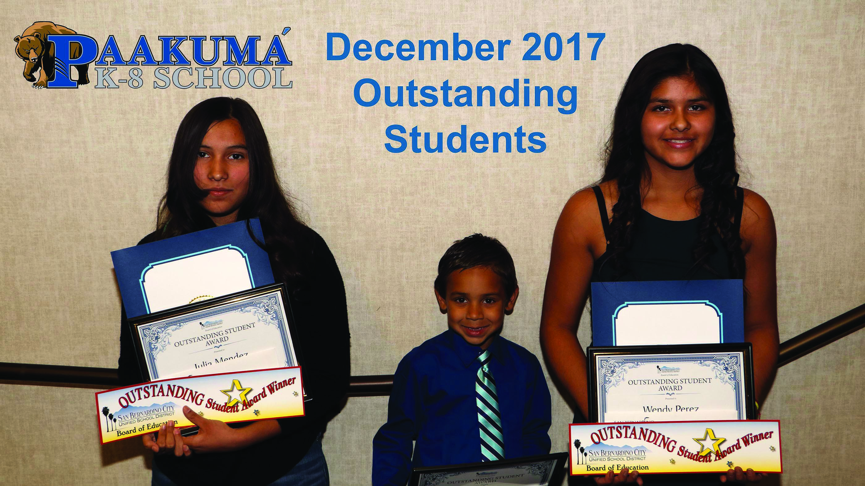 The San Bernardino City Unified School District Board of Education named three Paakuma’ K–8 School students as Outstanding Students for December 2017. Pictured from left are Julia Mendez, 6th grade, Matthew Smith, Kinder, and Wendy Perez, 8th grade.