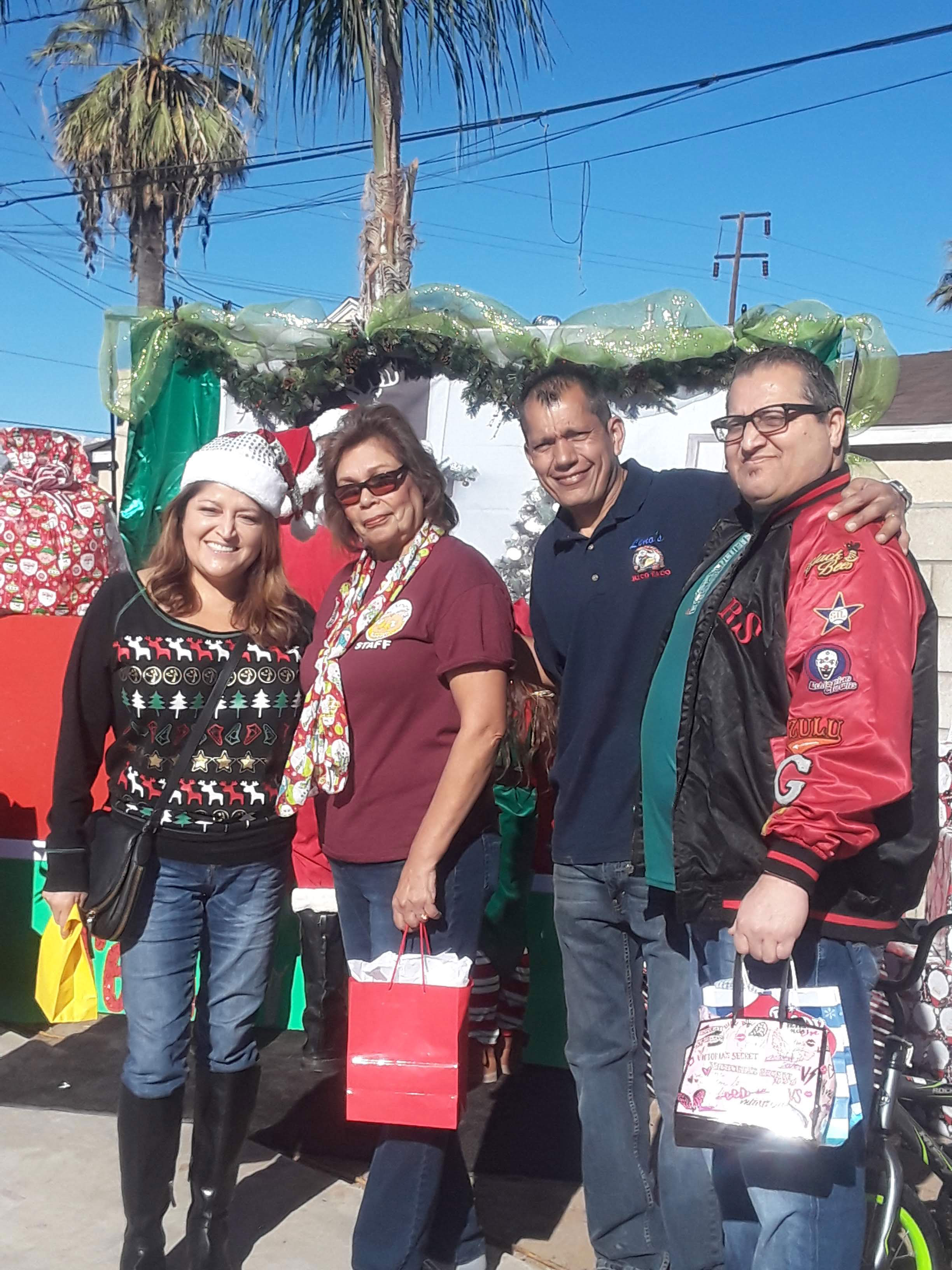 IECN photo Maryjoy Duncan: Non-profit organization Seeds of Hope hosted its 10th annual toy giveaway behind Leno’s Rico Taco on Saturday, Dec. 15, with 300 local youth receiving donated toys. Pictured from left: Former City Clerk Eileen Gomez who is currently the city clerk of Laguna Niguel, Seeds of Hope Executive Director Gloria Gaona, Leno’s Ricos Tacos owner Leno Moreno and Eileen’s brother, Rudolph Gomez.
