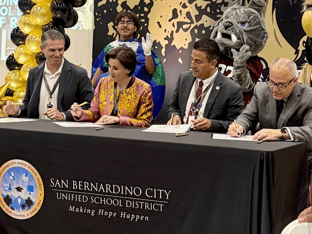 San Bernardino City Unified School District (SBCUSD) entered into a remarkable partnership with the University of Redlands that will allow qualifying Arroyo Valley High School (AVHS) scholars to enroll in the University of Redlands Dual Credit Program, with all associated academic privileges, at no cost to them and with the ability to take geographic information system (GIS)-related college courses during their regular school day.