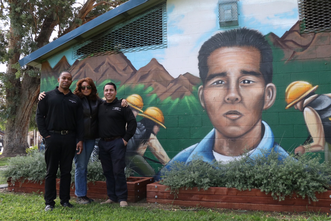 IECN Photo/Anthony Victoria: Urban Conservation Corps Director Sandy Bonilla (center), Deputy Director Andrew Goodman (left), and staff member Abel Chacon stand next to a mural of Corps Founder Bobby Vega.