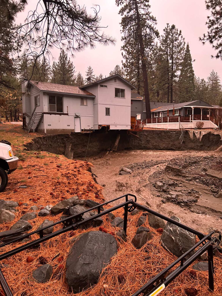 Photos by Maximilian Morici: A Wrightwood home sits precariously on an unstable foundation after floodwaters and debris flows washed away the soil and support beneath part of the structure.
